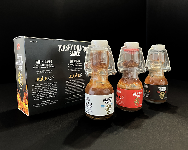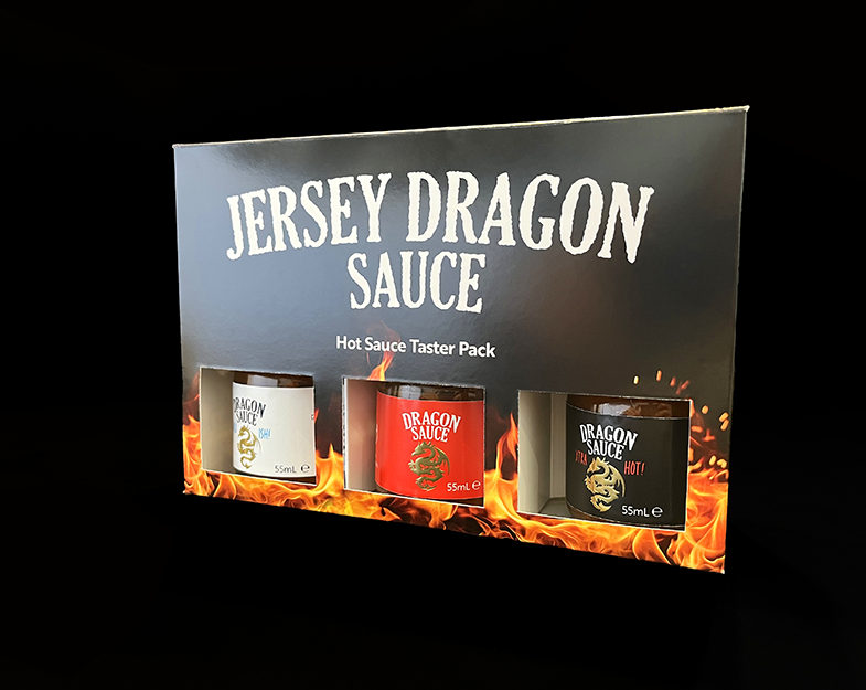 To match the quality of this artisan chilli sauce, we created two premium packaging pieces for the local market. The first was a taster set: a custom box with insert and gold-foiled labels, designed to house three bottles and give customers a proper introduction to the heat.