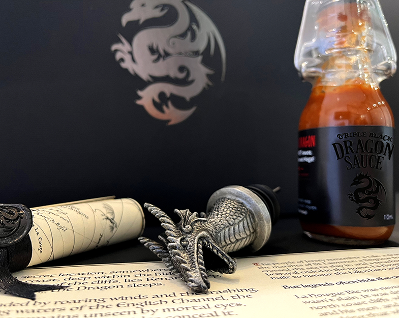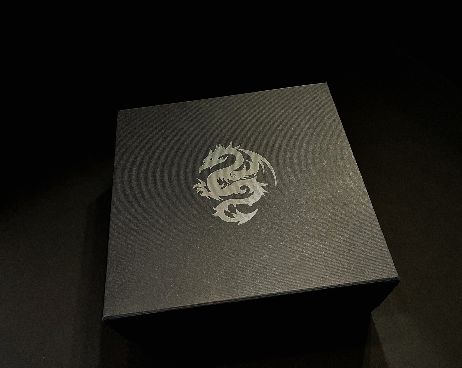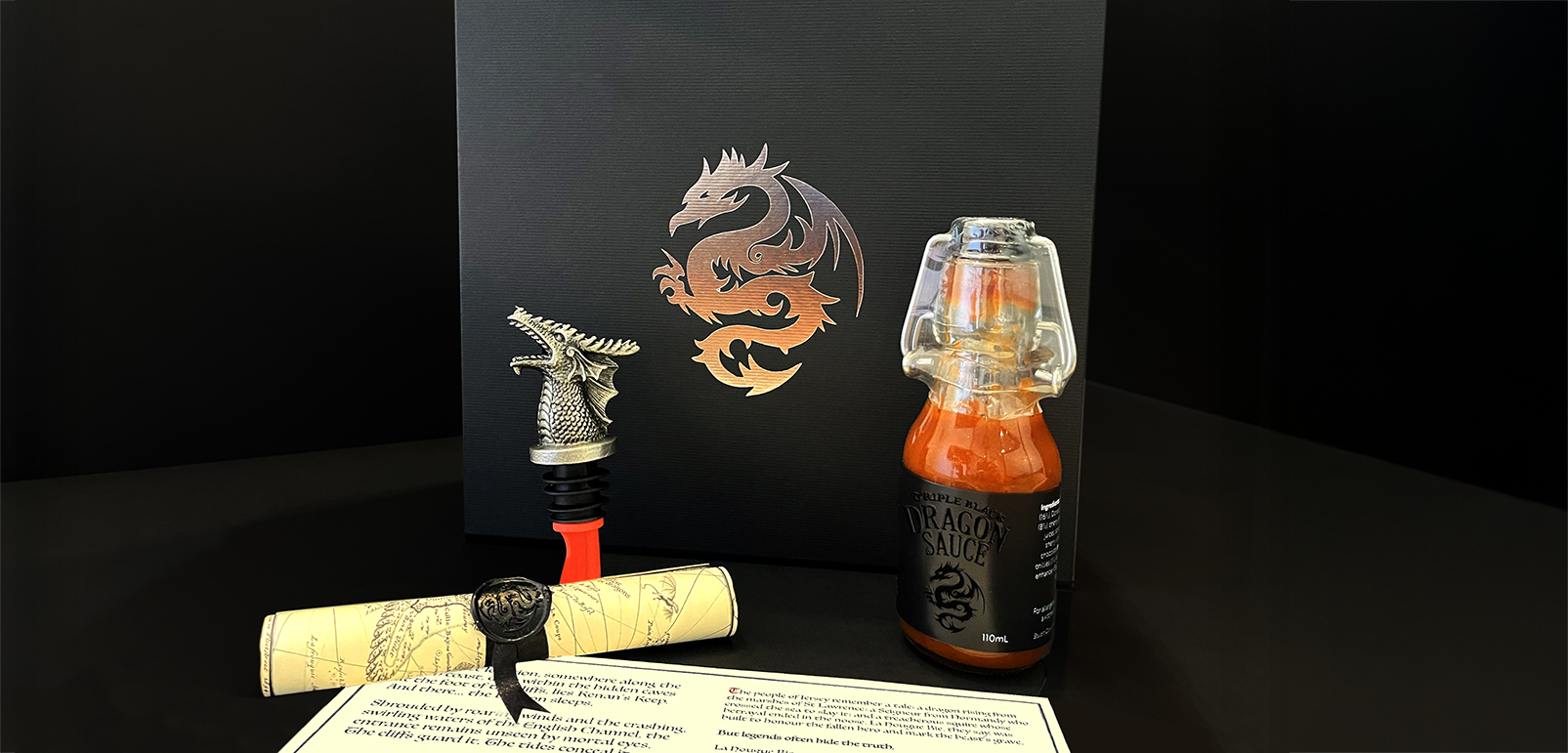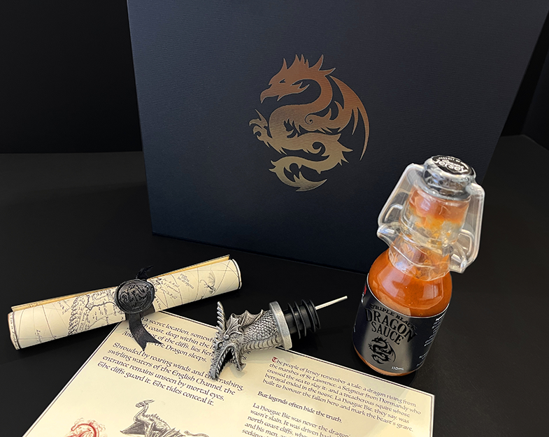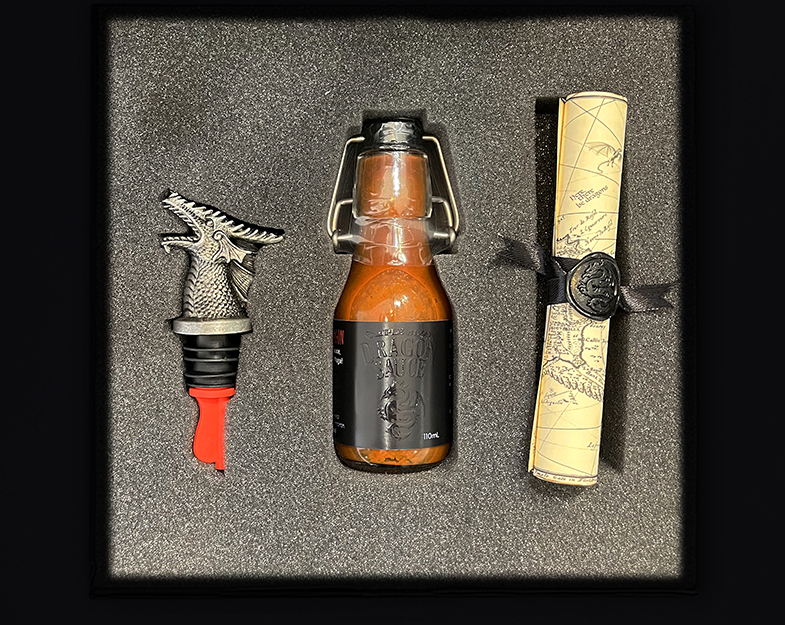 The second was something special. A limited run of just 50 bottles, each one dressed in a Triple Black Dragon label with custom UV print. We designed a bespoke certificate on cream cotton paper with burnt edges, finished with black ribbon and a custom wax seal. Add a dragon pourer for drama, all presented in a black box foiled in gunmetal with a custom foam insert. The result? Packaging as bold as the sauce inside.